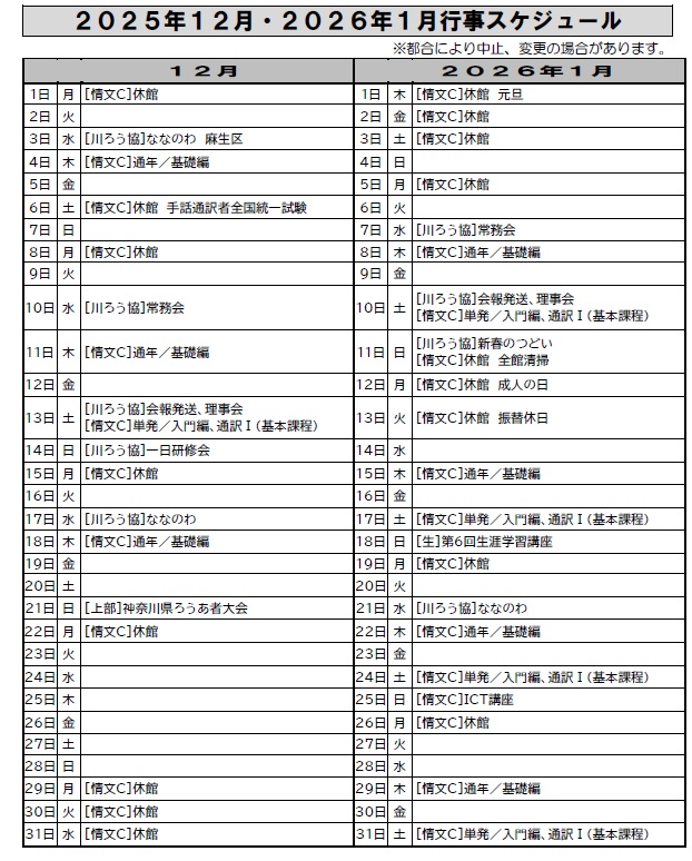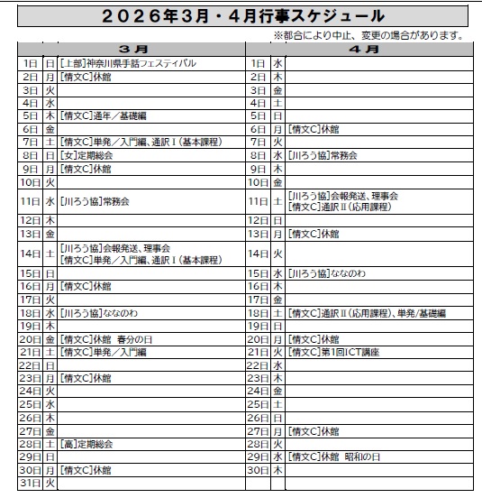 [略称]について[川ろう協]・・・川崎市ろう者協会、[手]・・・手話対策部、[福]・・・教育福祉対策部、[企]・・・企画部、 [女]・・・女性部、[高]・・・高齢部、[組]・・・組織部、[生]・・・生涯学習講座担当、[広]・・・広報部[情文C]・・・川崎市聴覚障害者情報文化センター、[川身協]・・・川崎市身体障害者協会[上部]・・・全日本ろうあ連盟、関東ろう連盟、神奈川県聴覚障害者連盟など